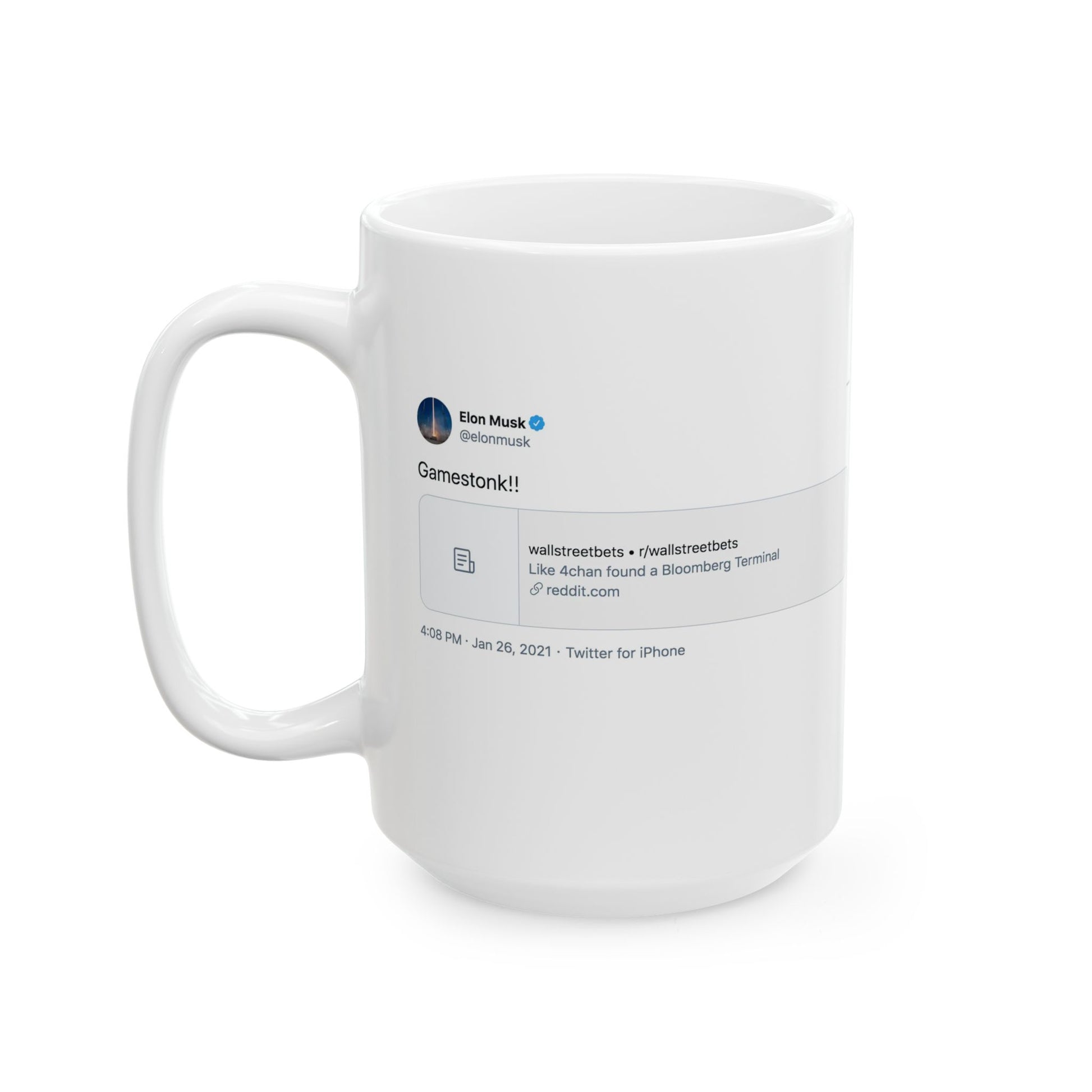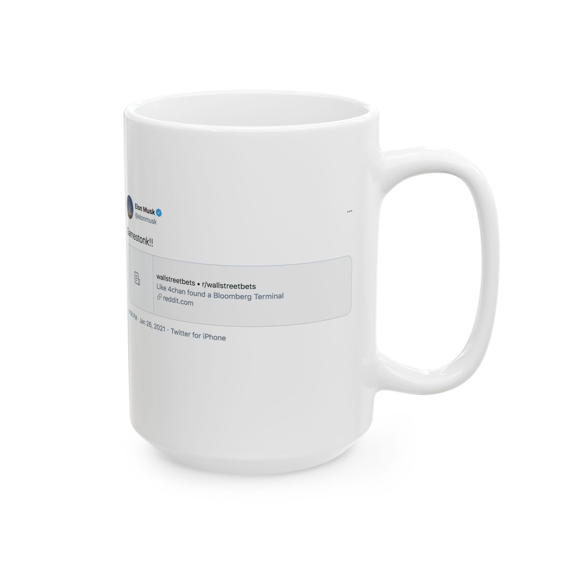 This mug features Elon Musk’s legendary “Gamestonk!!” tweet from January 26, 2021 — the exact moment he launched GME into the stratosphere with a single word and a Reddit link. A true artifact from the meme stock revolution.