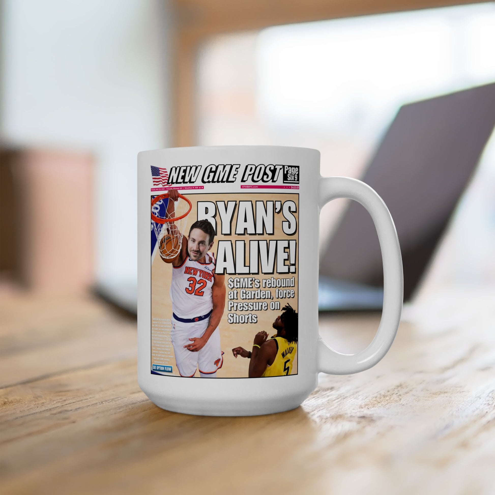 Part of the exclusive RC x MSG Collection, this limited-edition ceramic mug immortalizes Ryan Cohen’s surprise front-row appearance at Game 5 of the Eastern Conference Finals — the moment that reignited the GME movement on May 29th. Featuring the bold, tabloid-style “RYAN’S ALIVE!” headline, this design captures the chaos, speculation, and meme-fueled energy that swept through the community.