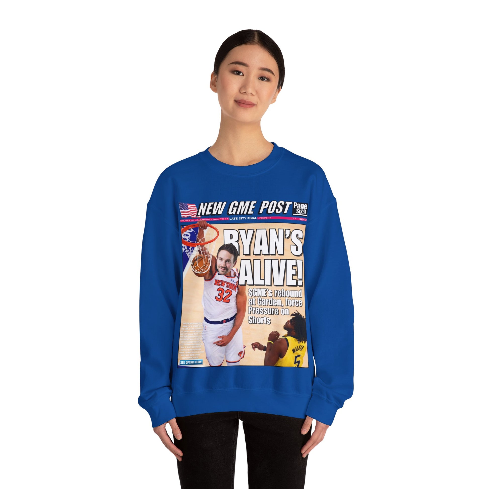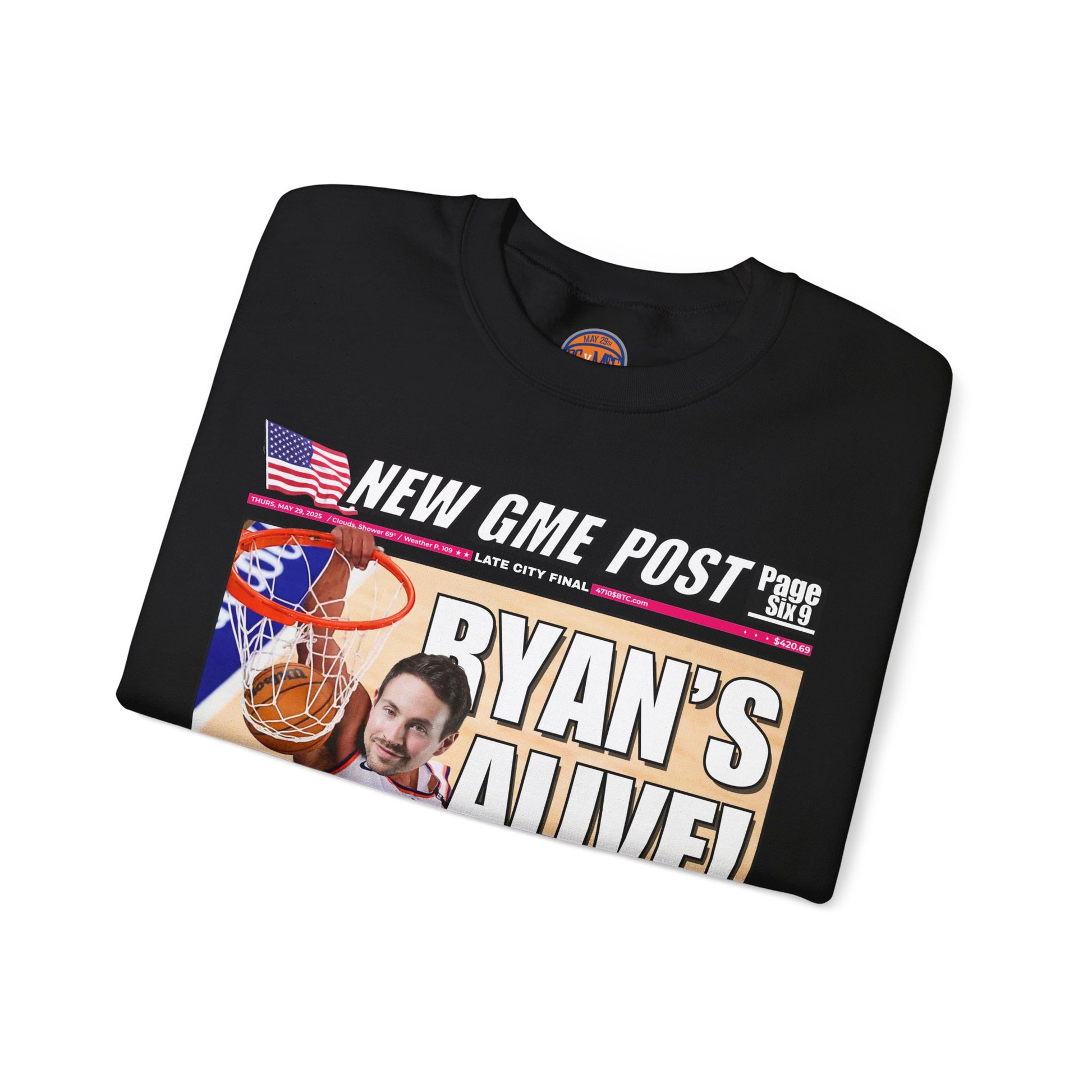 Featuring the bold “RYAN’S ALIVE!” tabloid-style headline, this collectible sweatshirt captures the chaos, speculation, and excitement that rippled through Reddit, Superstonk, and WallStreetBets on May 29th. Whether you're a longtime GameStop holder, a fan of Roaring Kitty, or just love iconic meme culture, this piece delivers both statement and comfort.
